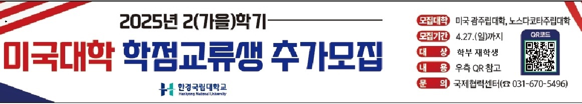 2025학년도 2(가을)학기 미국대학 학점교류 프로그램 참가자를 추가모집하니, 관심있는 재학생의 신청 바랍니다.