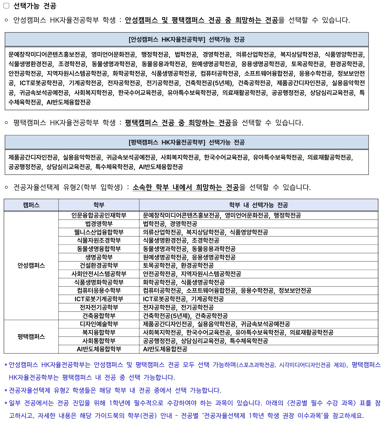 fnctId=bbs,fnctNo=729 RSS 2.0 총 6 개의 게시물이 있습니다. 게시물 검색 제목 작성자 게시글 리스트 질문 선택할 수 있는 전공은 무엇무엇이 있나요? 답변 질문 전공은 한번 선택하면 바꿀 수 없나요? 답변 4학기 이상 등록한 학생 중 배정된 전공을 변경하고 싶은 경우 1회에 한하여 전공을 변경할 수 있습니다. 질문 전공 선택은 언제 하나요? 답변 2학기 이상 등록한 학생들은 2학기 중 전공 배정 신청을 하게 됩니다. 전공배정 시기는 매 학기말 학사공지(https://hknu.ac.kr/kor/562/subview.do)를 통해 공고되며, 보통은 학기말(6월 초, 12월 초) 전공배정 신청서를 작성하여 제출합니다. 질문 전공자율선택제 학생은 어떤 방식으로 전공을 탐색하나요? 답변 전공자율선택제 학생들은 전공 탐색 관련 교과목 수강, 새내기성공지원센터를 비롯하여 다양한 부서의 비교과 프로그램 참여, 학사지도상담 및 멘토링 참여 등을 통해 단계적으로 전공을 탐색하게 됩니다. 질문 전공자율선택제 유형1, 유형2가 무슨 뜻인가요? 답변 전공자율선택제 유형1(HK자율전공학부)은 학생이 전공 없이 입학한 후 전공을 선택하게 되며, 성적 등 제한 없이 원하는 전공을 선택할 수 있습니다. * 안성캠퍼스 HK자율전공학부 학생 : 스포츠과학전공 및 시각미디어디자인전공을 제외한 안성캠퍼스, 평택캠퍼스 전공 중 희망하는 전공 선택 가능 * 평택캠퍼스 HK자율전공학부 학생 : 평택캠퍼스 전공 중 희망하는 전공 선택 가능 전공자율선택제 유형 2(HK자율전공학부를 제외한 학부 입학생)의 경우 학생이 학부를 선택하여 입학한 후, 해당 학부 내에 있는 전공을 선택할 수 있습니다. 유형1이 선택할 수 있는 전공의 범위가 더 넓으며, 두 유형 모두 1년 간의 충분한 전공탐색 과정을 거친 후 전공을 선택할 수 있다는 점은 동일합니다. 질문 전공자율선택제는 일반 전공으로 입학하는 것과 무엇이 다른가요? 답변 전공자율선택제란 학생이 전공을 정하지 않고 입학한 후 대학의 체계적인 지원 하에서 진로를 탐색하고 전공을 자유롭게 선택할 수 있는 제도로, 학생이 원하는 전공을 100% 선택할 수 있도록 전공선택의 자유를 보장하는 제도입니다. 우리 대학 학부 운영은 일반전공(전공으로 입학하여 해당 전공으로 졸업)과 전공자율선택제(입학 시 전공을 확정하지 않고, 1학년 동안 여러 전공을 탐색한 뒤 본인에게 맞는 전공을 선택하는 제도)로 나뉘어집니다. 일반 전공 입학은 입학과 동시에 소속 전공이 확정되는 반면, 전공자율선택제 학생들은 입학 시 전공을 확정하지 않고 1학년 동안 여러 전공을 충분히 탐색한 뒤 본인에게 맞는 전공을 선택할 수 있습니다. 처음 11 1 끝