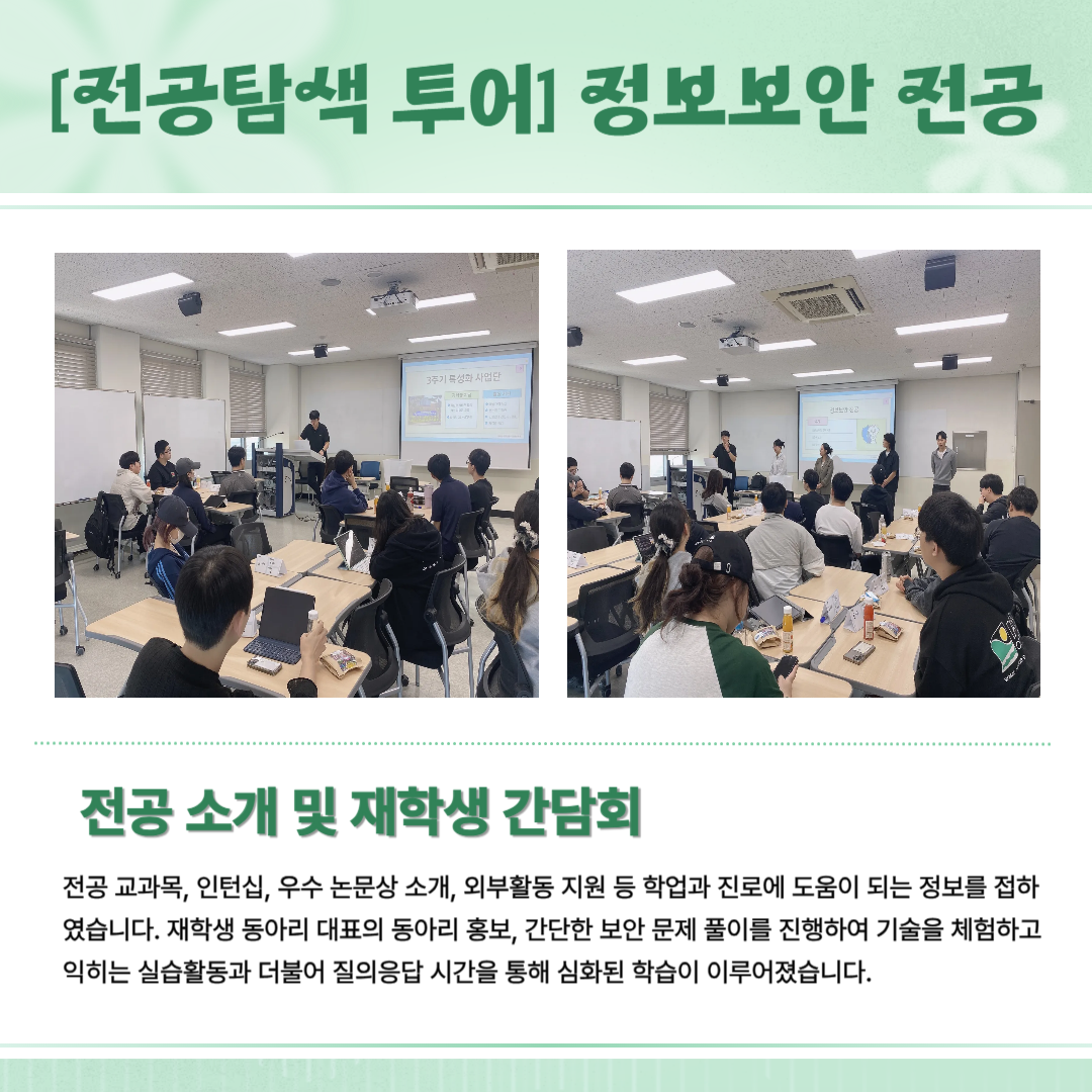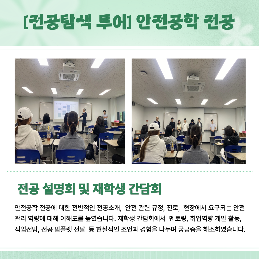 실무와 현장을 직접 체험할 수 있는 교수님 강연 및 실습실 탐방, 재학생 간담회 등 다양한 활동을 소개합니다.😊